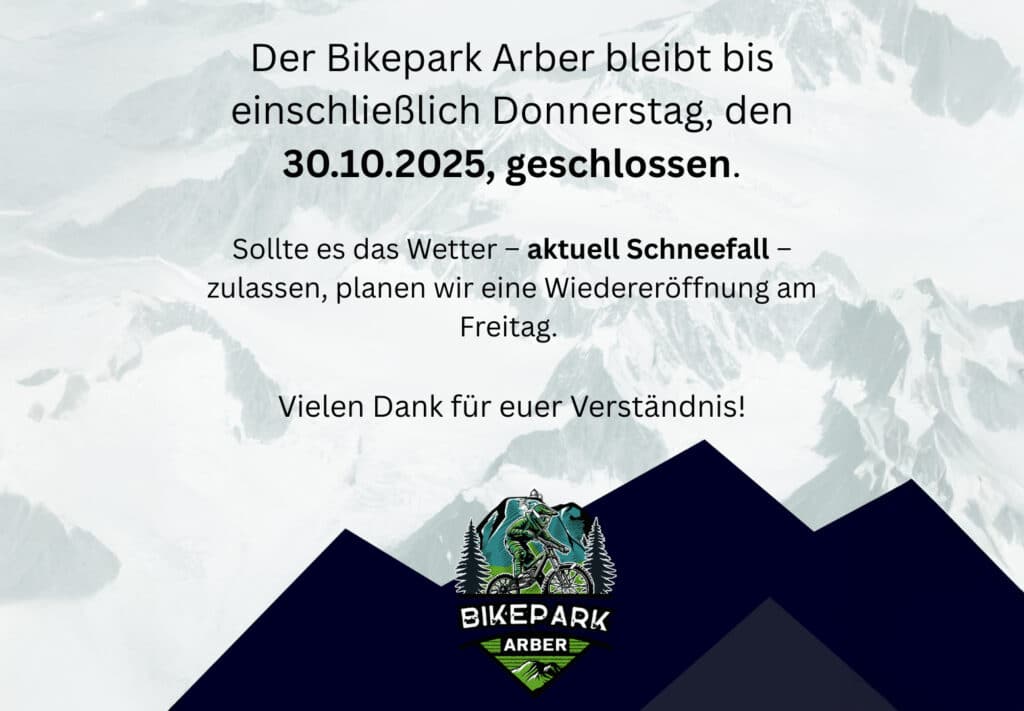 🚵♂️ Bikepark Arber – vorübergehend geschlossen ❄️ Der Bikepark Arber bleibt bis einschließlich Donnerstag, 30.10.2025, geschlossen. Wenn es das Wetter zulässt – aktuell Schneefall – planen wir eine Wiedereröffnung am Freitag. Bitte beachtet die aktuellen Meldungen, um über den genauen Öffnungsstatus informiert zu bleiben. Vielen Dank für euer Verständnis! 🙌 🚵♂️ Bikepark Arber – dočasné […]