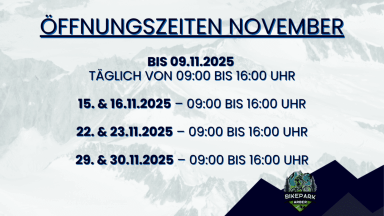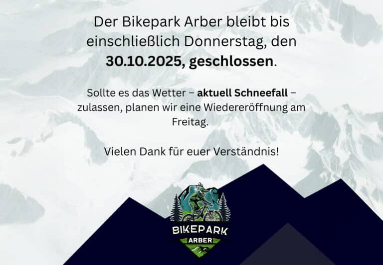 🚵‍♂️ Bikepark Arber – vorübergehend geschlossen ❄️ Der Bikepark Arber bleibt bis einschließlich Donnerstag, 30.10.2025, geschlossen. Wenn es das Wetter zulässt – aktuell Schneefall – planen wir eine Wiedereröffnung ...